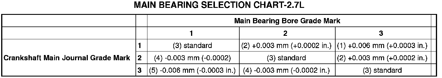 Refer to the selection chart to properly select the main bearings. For an example, if the main bore grade is 3 and the journal grade is 2, the proper select fit bearing would be (2) +0.003 mm (+0.0002 in.).