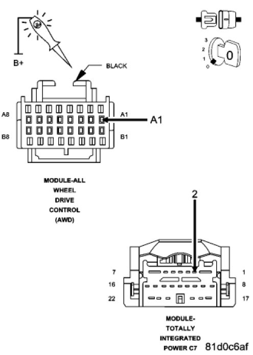 With a 12-volt test light connected to B(+), check the (F202) Ignition Switch Output (RUN/START) circuit in the AWD Control Module harness connector.
