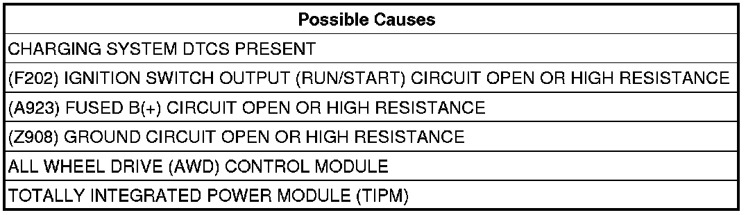 The All Wheel Drive Control Module detects that system voltage is below 8.0 volts for 10 seconds.