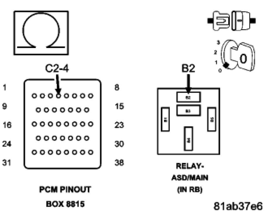 Using a 12 volt test light connected to ground, check the (F343) Fused ASD Relay Output circuit in the Fuel Injector 6 harness connector.