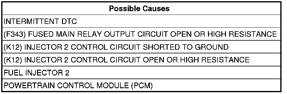 - Repair the (K12) Injector 2 Control circuit for an open circuit or high resistance.