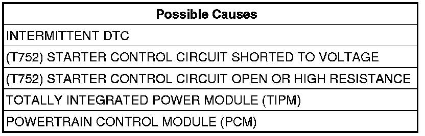 - Repair the (T752) Starter Control circuit for an open circuit or high resistance.