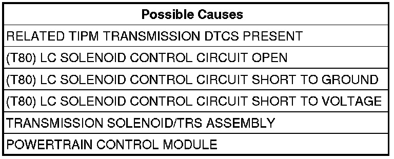 - Repair the (T80) LC Solenoid Control circuit for an open.