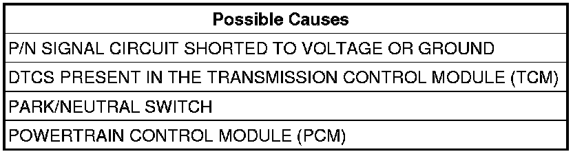 Inspect the P/N signal circuit for a short to ground, or a short to voltage with the shifter in Drive or Reverse.