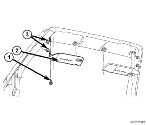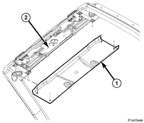 13. Install the windshield header lower trim panel (1) by pushing the panel upwards until the retaining clips are fully secured to the slots in the power folding top presenter plate assembly (2).