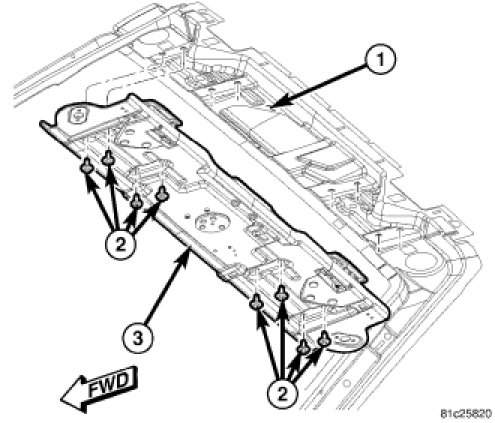 4. Observing the location marks made during removal, position the folding top presenter plate assembly (3) onto the bottom side of the windshield header (1).