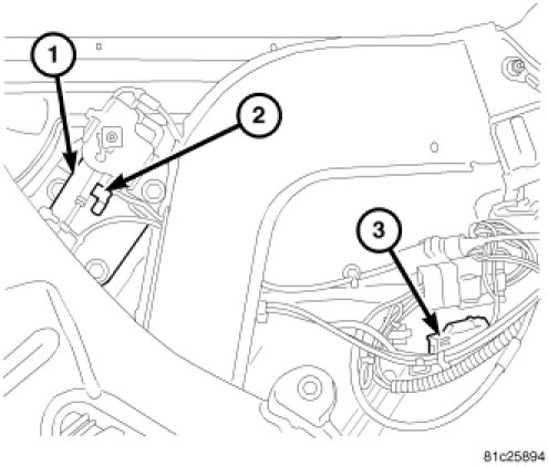 4. Connect the position switch (2) wire harness routing clips to the left inner quarter panel.