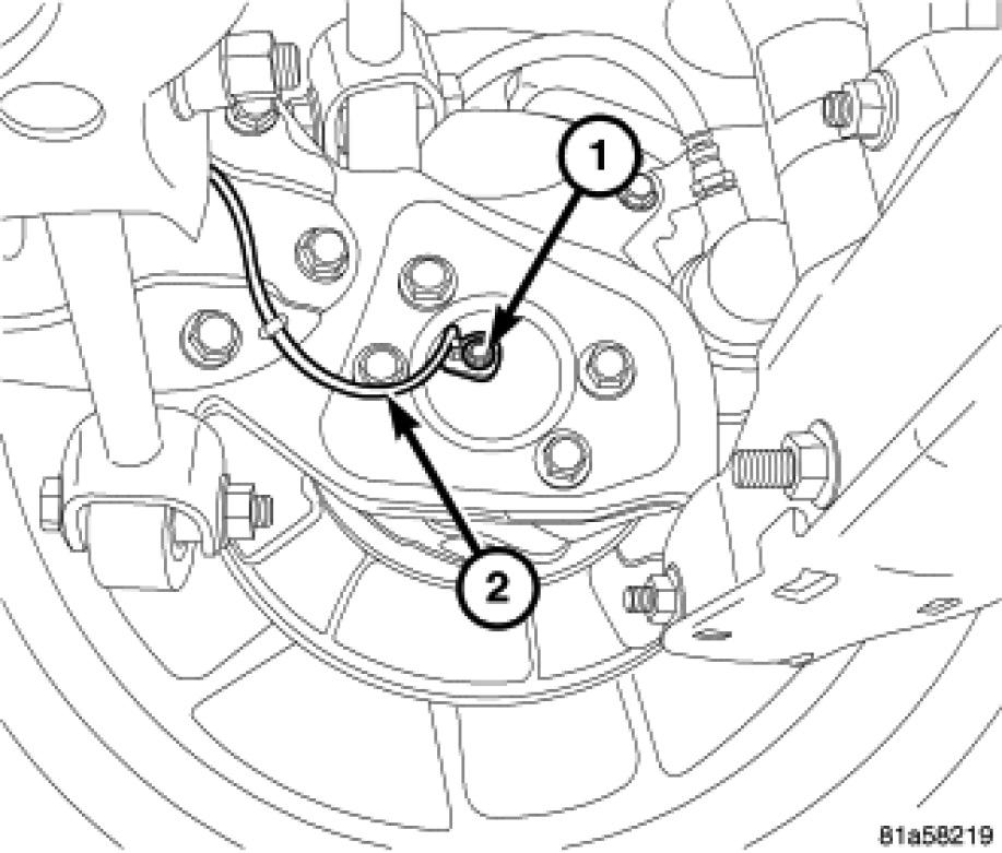 1. Install the wheel speed sensor (2) head into the rear of the hub and bearing.