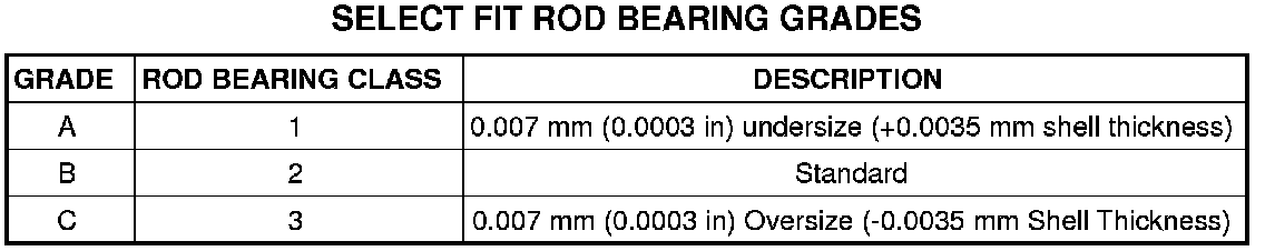 Limits of taper or out-of-round on any crankshaft journals should be held to specification limits. Bearings are available in 0.007 mm oversize (0.0003 in oversize), standard, 0.007 mm (0.0003 in) undersize 0.025 mm (0.001 in) undersize, and 0.254mm (0.010 in undersize. Install the bearings in pairs. Do not use a new bearing half with an old bearing half. Do not file the rods or bearing caps.
