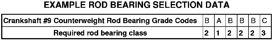 This example shows how to determine the bearing class needed for each rod bearing, assuming that a new crankshaft is being installed in a new or existing engine block. If the code 'B' 'A' 'B' 'B' 'B' 'C' is stamped on the #9 counterweight of the crankshaft (3), then rod #1 would require Class 2 bearings, rod #2 would require Class 1 bearings, rod #3 would require Class 2 bearings, rod #4 would require Class 2 bearings, rod #5 would require Class 2 bearings, and rod #6 would require Class 3 bearings.