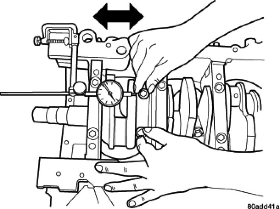 1. Mount a dial indicator to a stationary point on engine. Locate probe perpendicular to and resting against the connecting rod cap being checked. Move connecting rod all the way to rear of its travel (toward flywheel end of crank). Zero the dial indicator. Move connecting rod forward of to limit of travel (toward pulley end of crank) and read the dial indicator. Compare measurement to specification listed in engine specifications Engine Specifications. Repeat procedure for each connecting rod. Turn crankshaft for connecting rod accessibility.
