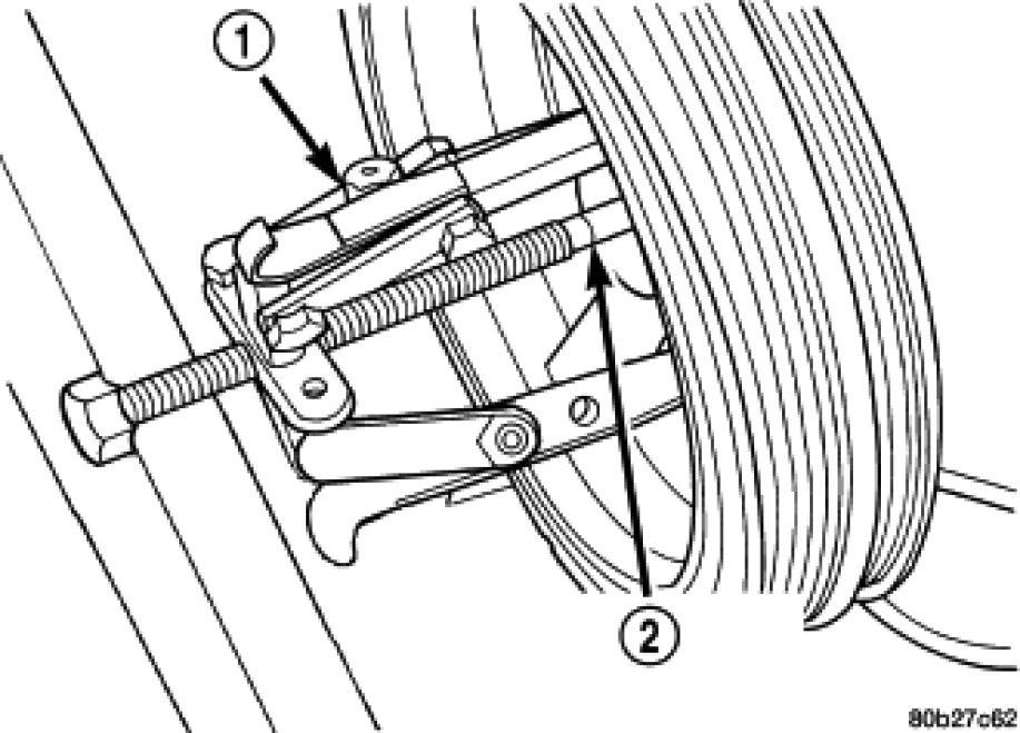 10. Use Special Tool 1023 puller (1) , and insert 9020-R (2), remove crankshaft damper.