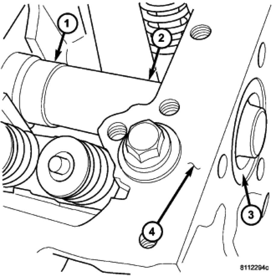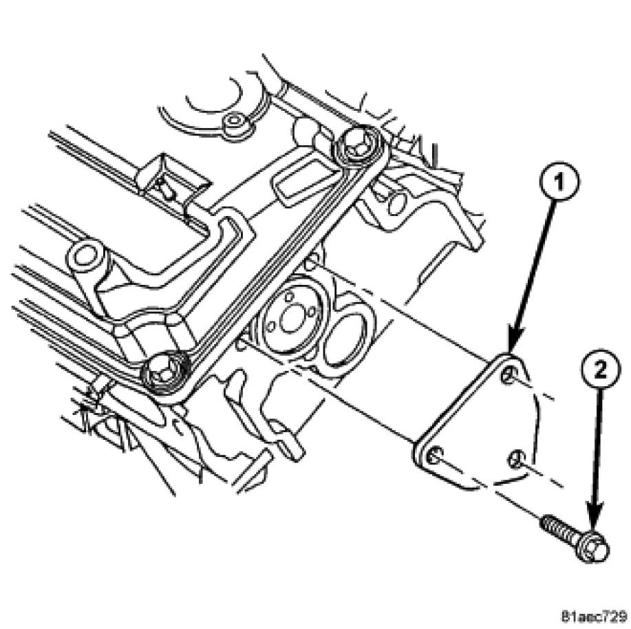 12. Install the rear camshaft thrust plate (1).