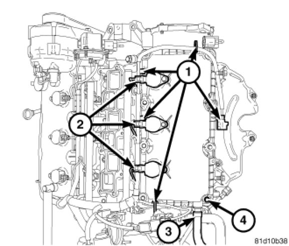 6. Reconnect the wire harness retainers (1) to the valve cover.