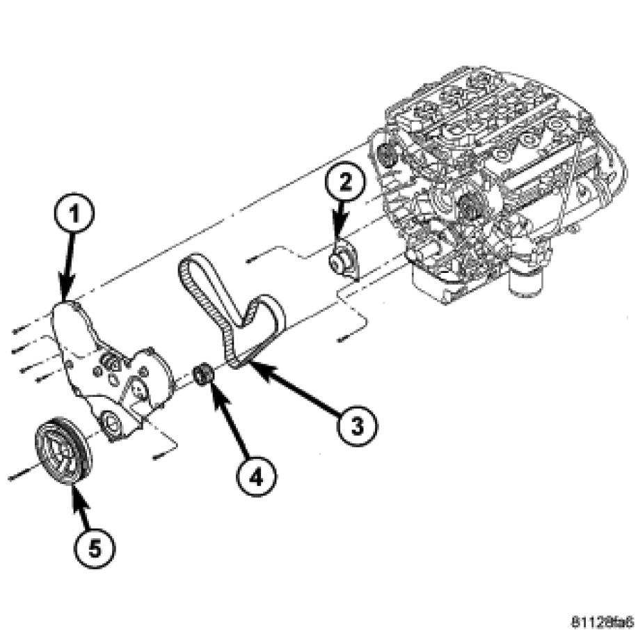The timing drive components include a crankshaft sprocket, camshaft sprockets, tensioner pulley, hydraulic tensioner and a timing belt. The water pump is driven by the back side of the timing belt. The right and left camshaft sprockets are keyed and not interchangeable because of the cam sensor pick-up wheel on the left sprocket.