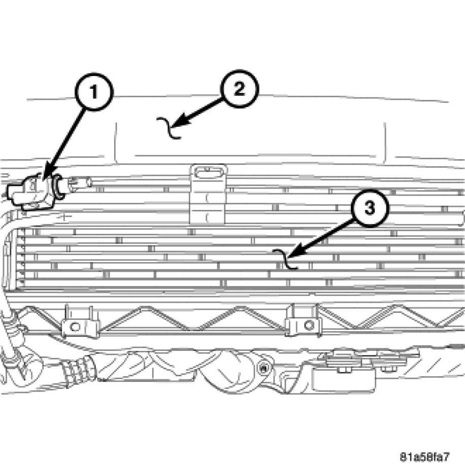1. Working through the opening in the right side of the front fascia, position the ambient temperature sensor (1) in the vehicle.