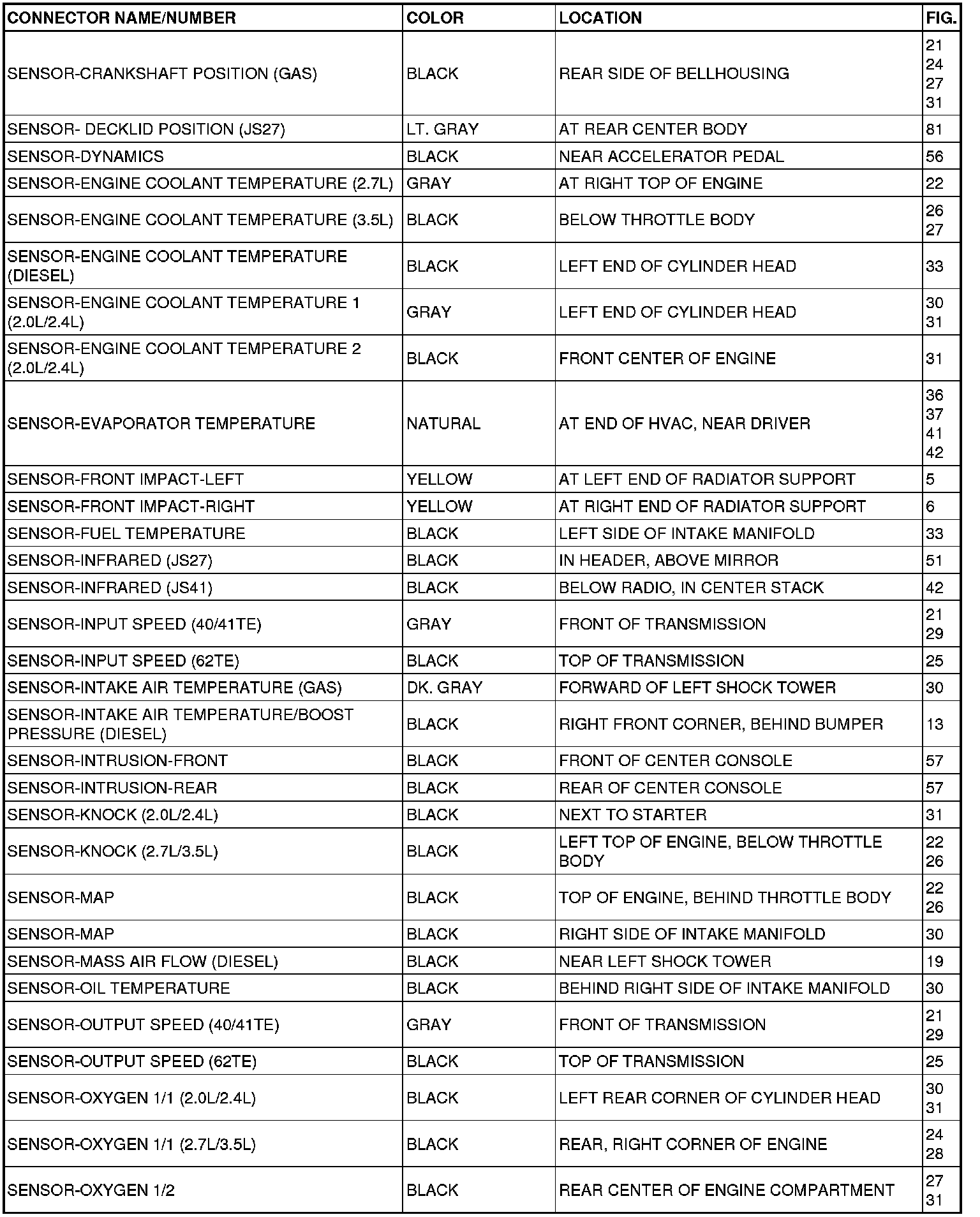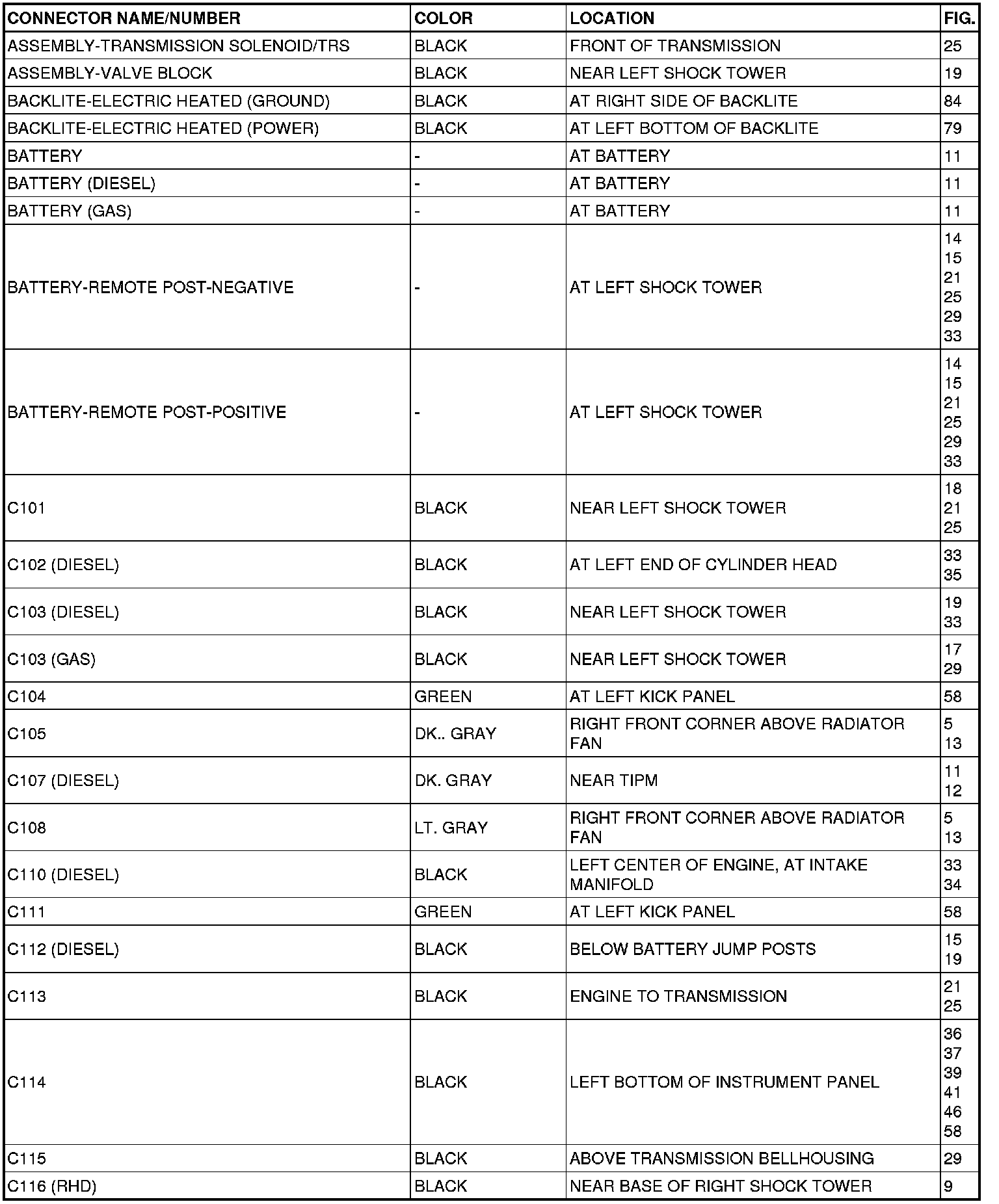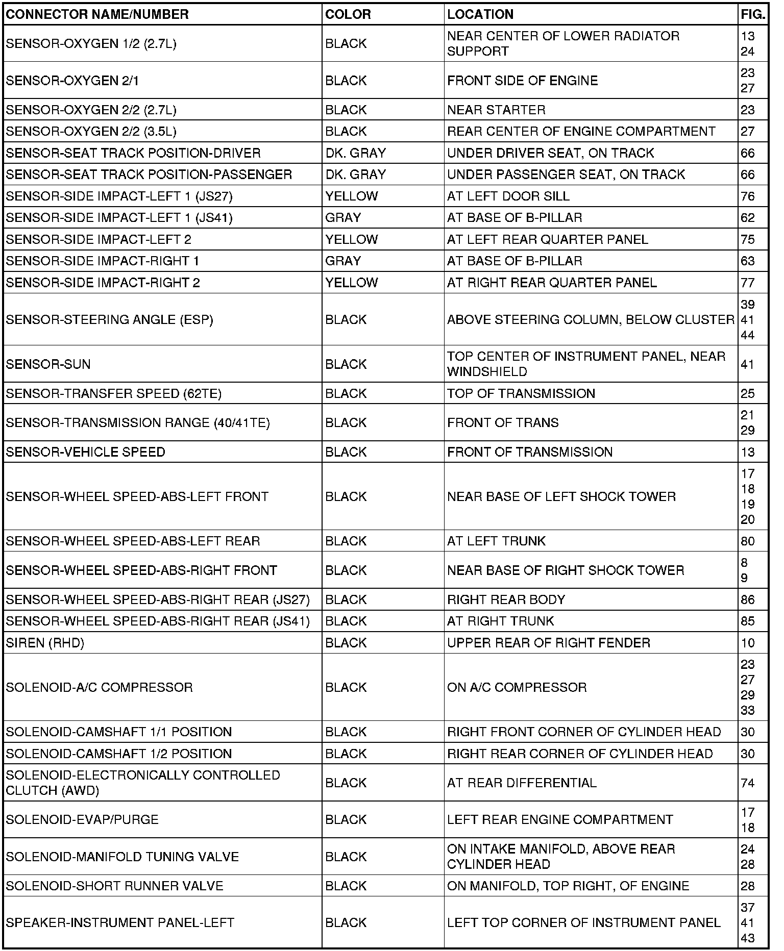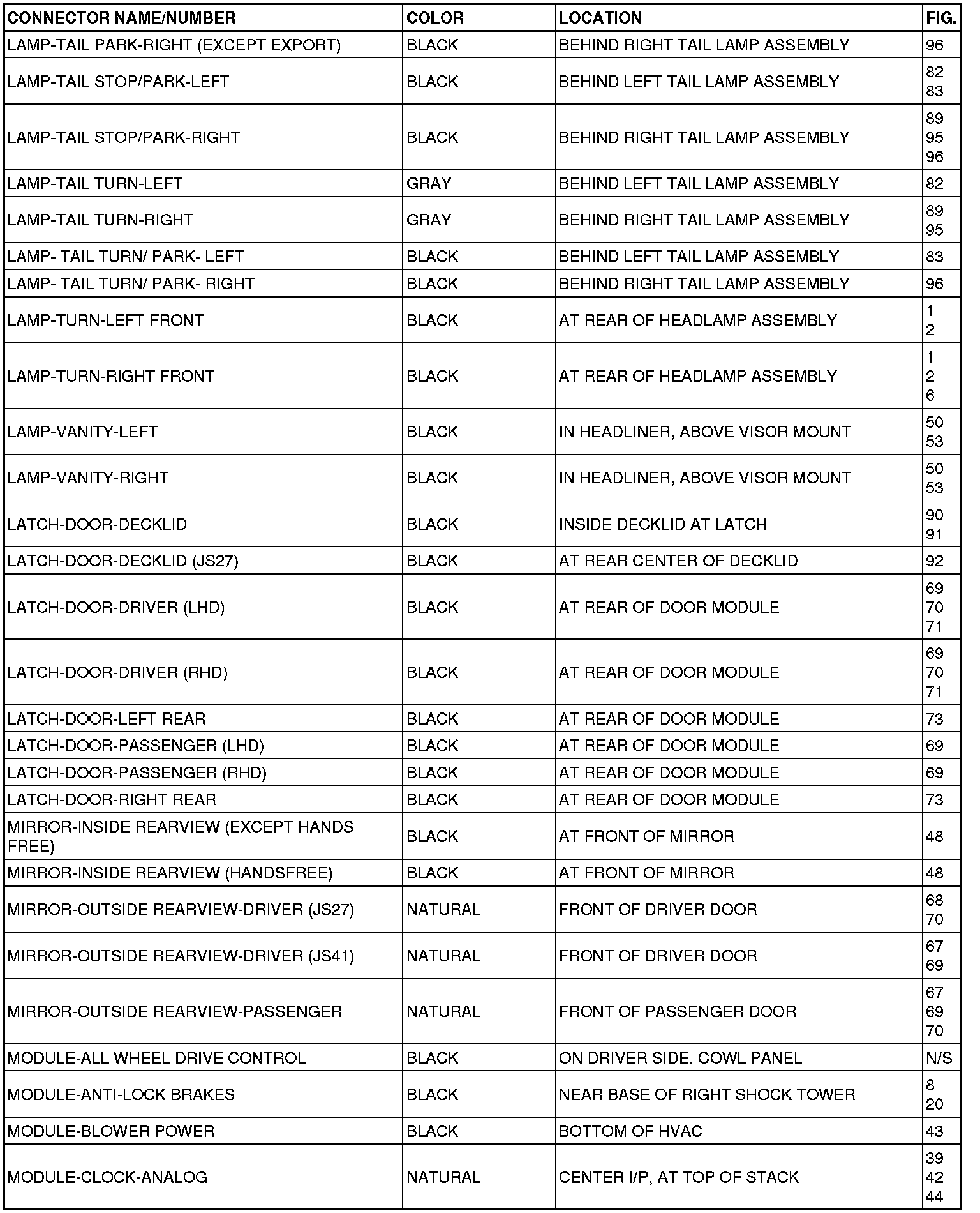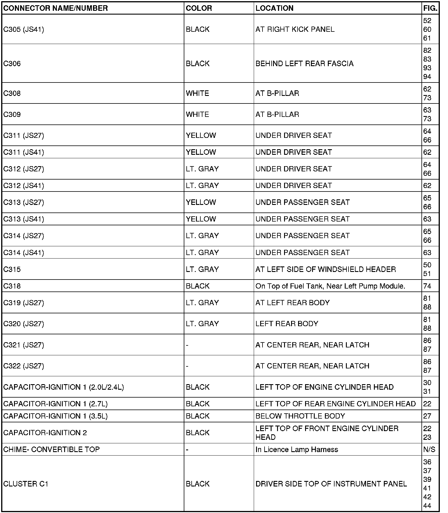 This section provides illustrations identifying connector, ground and splice locations in the vehicle. Connector, ground and splice indexes are provided. Use the wiring diagrams in each section for connector, ground and splice identification. Refer to the appropriate index for the proper figure number. For items that are not shown in this section N/S is placed in the Fig. column.
