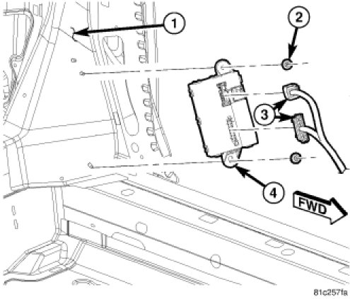 1. Position the Power Top Control Module (PTCM) (4) onto the mounting studs of the lower left quarter panel (1).
