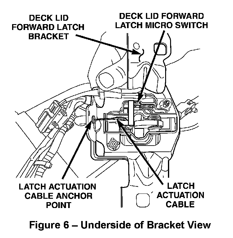 p. Place the latch bracket into position upside down on the vehicle. Then connect the latch release cable to the latch pawl and bracket anchor as noted in Step 12g of this procedure (Figure 6).