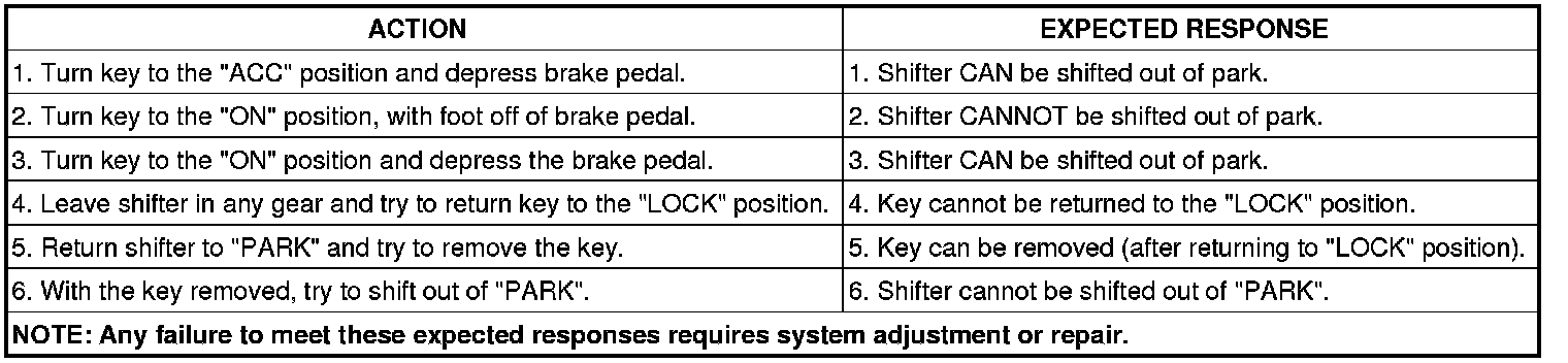 The following chart describes the normal operation of the Brake Transmission Shift Interlock (BTSI) system. If the "expected response" differs from the vehicle's response, then system repair and/or adjustment is necessary.
