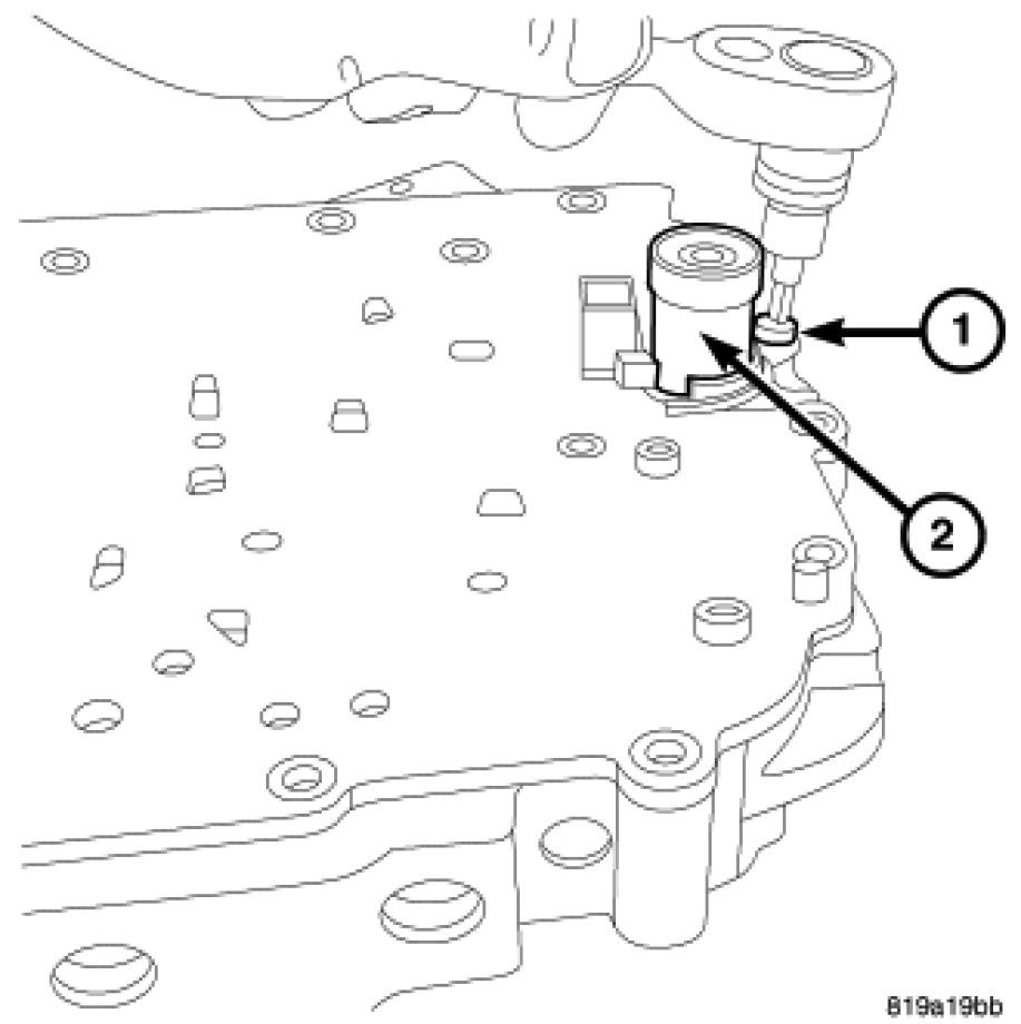 8. Install the bolt (1) at the pressure control solenoid (2) and tighten to 6 Nm (50 in. lbs.).