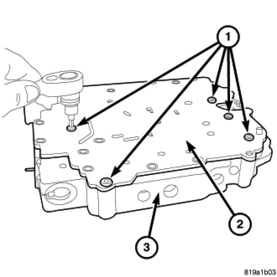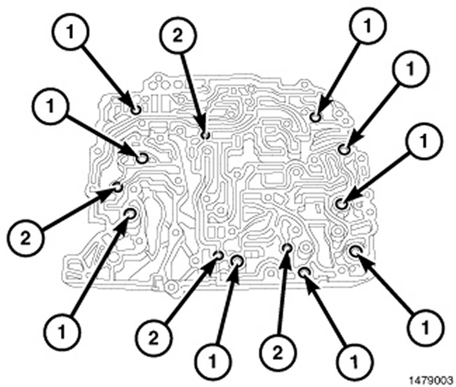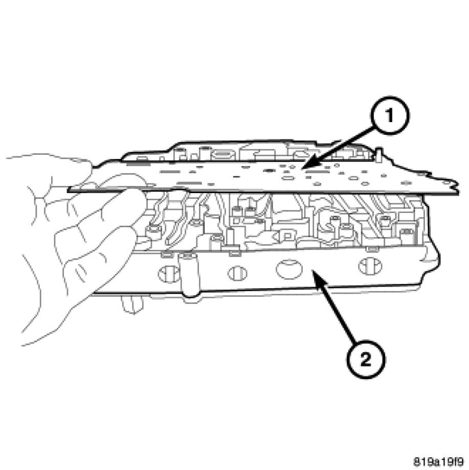 11. Install the solenoid pack (1) onto the valve body (2).