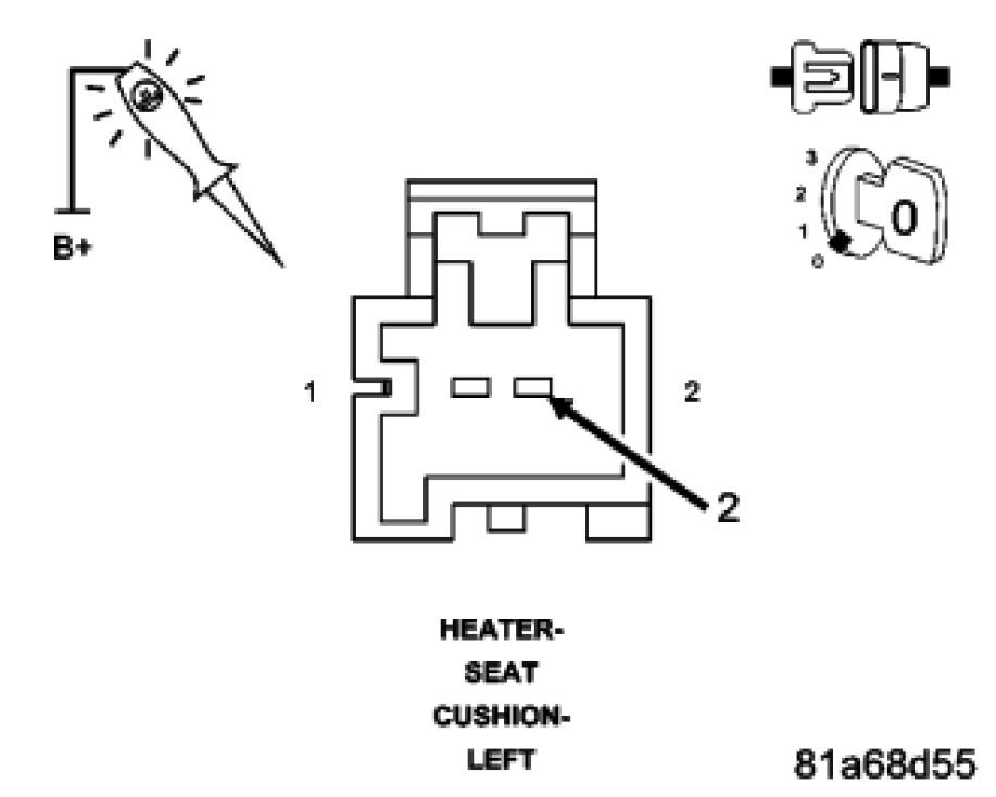 Using a 12-volt test light connected to 12-volts, check the (Z914) Ground circuit at the Left Seat Cushion Heater 2-way connector (harness side).