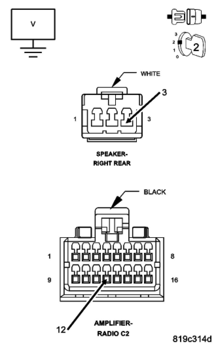 Measure for voltage on the (X304) Amplified Right Rear Speaker (+) circuit.
