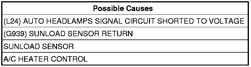 Measure the voltage of the (L24) Auto Headlamps Signal circuit between ground and the A/C Heater Control C1 harness connector.