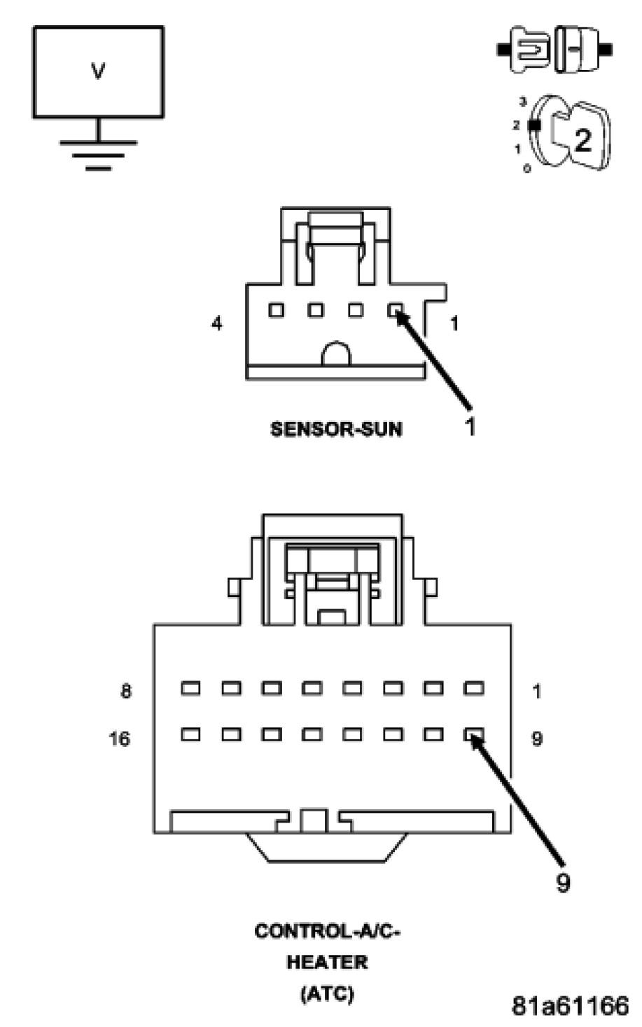 Measure the resistance of the (G939) Sensor Return circuit between the Sunload Sensor harness connector and the A/C Heater Control C1 harness connector.