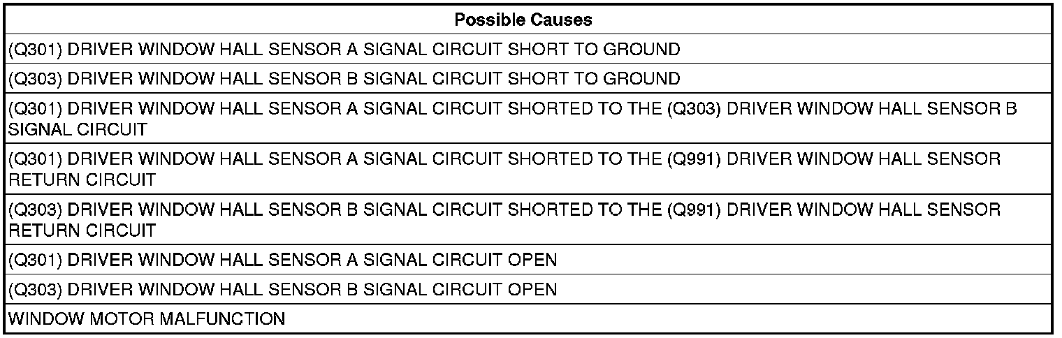 7. (Q301) DRIVER WINDOW HALL SENSOR A SIGNAL CIRCUIT SHORTED TO THE (Q991) DRIVER WINDOW HALL SENSOR RETURN CIRCUIT