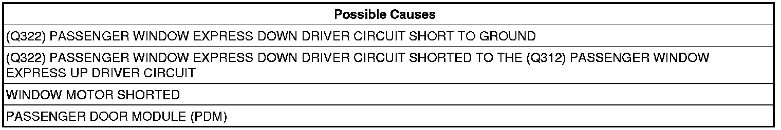 - Repair the (Q322) Passenger Window Express Down Driver circuit for a short to the (Q312) Passenger Window Express Up Driver circuit.
