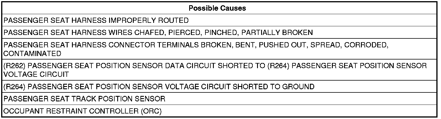 6. CHECK (R262) PASSENGER SEAT POSITION SENSOR DATA CIRCUIT FOR A SHORT TO (R264) PASSENGER SEAT POSITION SENSOR VOLTAGE CIRCUIT