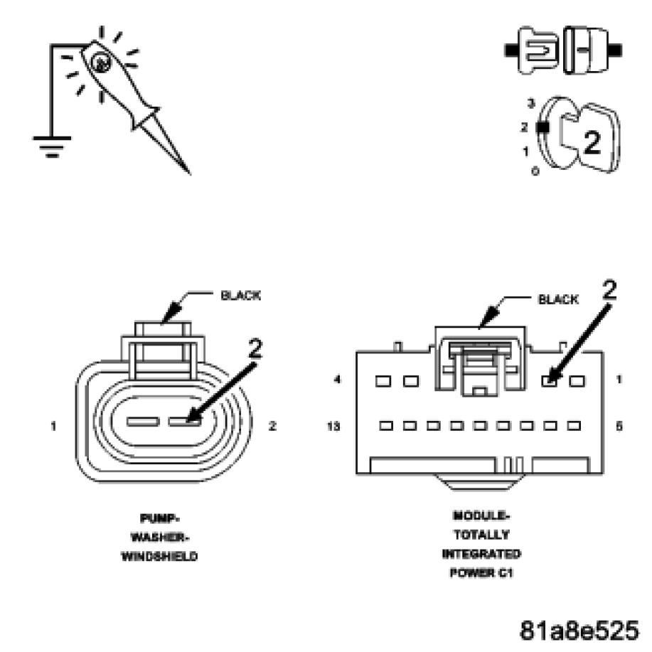 Using a 12-volt test light connected to ground, check the Fused Accessory Relay Output circuit in the Front Washer Pump Motor harness connector.