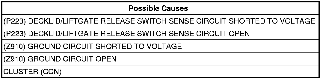 2. (P223) DECKLID/LIFTGATE RELEASE SWITCH SENSE CIRCUIT SHORTED TO VOLTAGE