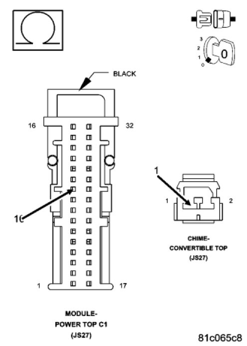 Measure the resistance of the (G98) Convertible Top Chime Signal circuit between the PTCM C1 harness connector and the Convertible Top Chime harness connector.