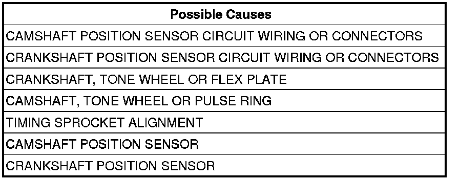 The PCM detects that the deviation between the camshaft position and the crankshaft position has exceeded the maximum acceptable value. One Trip Fault. Three good trips to turn off the MIL.