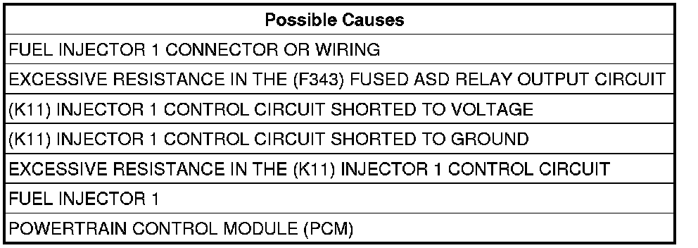 - Repair the short to ground in the (K11) Injector 1 Control circuit.