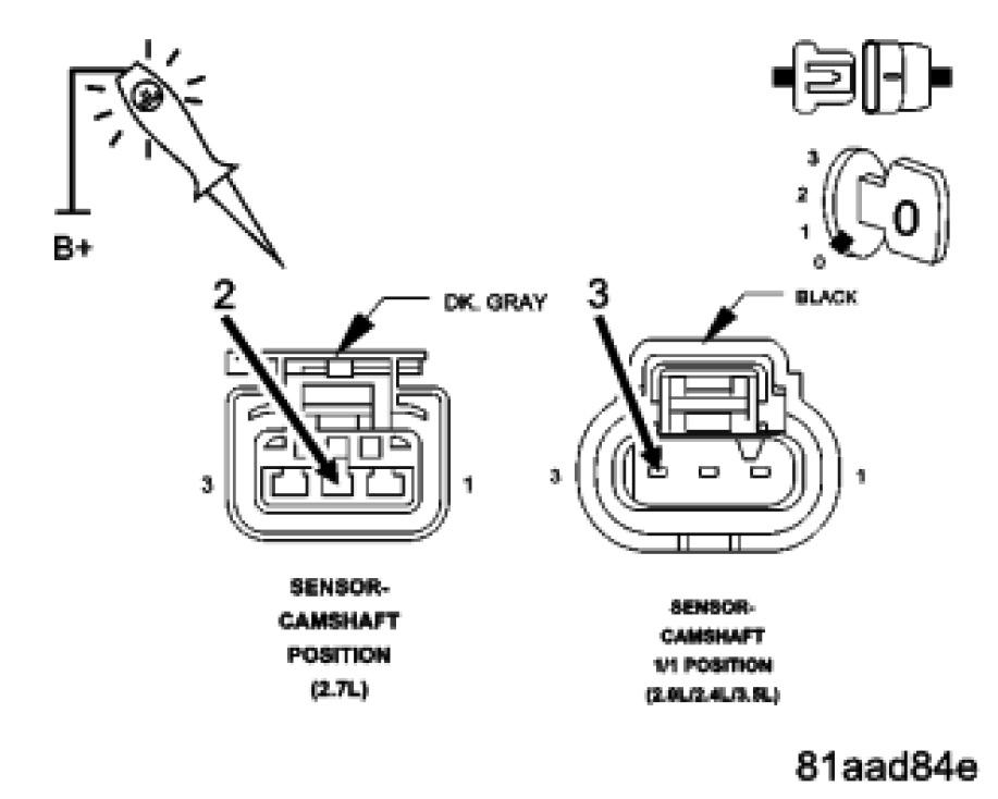 Using a 12 volt test light connected to 12 volts, check the (K900) Sensor Ground in the Camshaft Position Sensor harness connector.