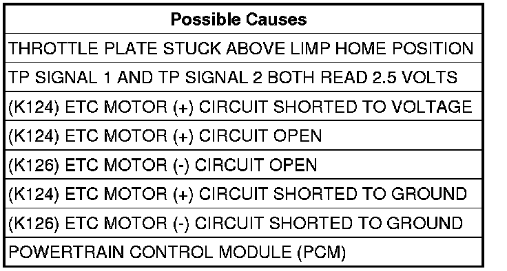 NOTE: The PCM tests the ETC Motor by opening and closing the Throttle Plate before starting the engine. If during this test the Throttle plate does not return to the closed position this DTC sets.