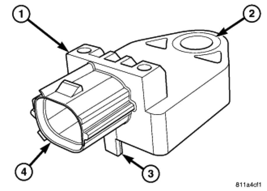 Four side impact sensors (1) are used on this vehicle when it is equipped with the optional side airbags, two each for the left and right sides of the vehicle. These sensors are mounted remotely from the impact sensor that is internal to the Occupant Restraint Controller (ORC). Each side sensor is secured with a screw to the right or left B-pillar and C-pillar.
