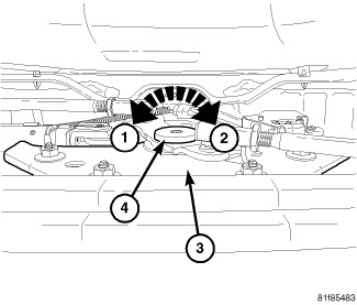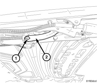 14. Verify the decklid is in the service position, remove the retaining clip (1) and pry the retractable tonneau linkage arm (2) from the pin on the screw drive.