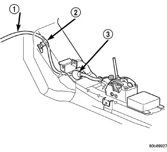 1. Install cable assembly into floor pan tunnel hole and secure grommet (3). If necessary, use a synthetic based lubricant to aid in grommet installation.