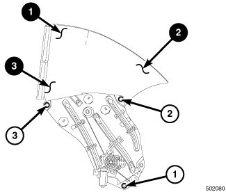 5. If the glass must be adjusted inboard, rotate the inner cam (3) counterclockwise (CCW) for the left front door or clockwise (CW) for the right front door.