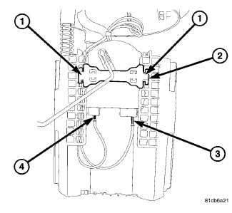 1. Correctly position fuel level sensor retaining tabs (1) to fuel pump module housing (2). Press to lock the fuel level sensor into place on the fuel pump module.