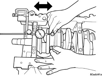1. Mount a dial indicator to a stationary point on engine. Locate probe perpendicular to and resting against the connecting rod cap being checked. Move connecting rod all the way to rear of its travel. Zero the dial indicator. Move connecting rod forward to limit of travel and read the dial indicator. Compare measurement to specification listed in engine specifications Engine - Specifications. Repeat procedure for each connecting rod. Turn crankshaft for connecting rod accessibility.