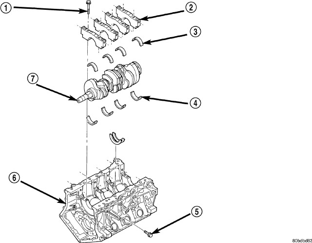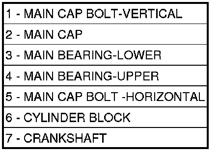 The cylinder block (6) is made of heat treated aluminum with cast-in-place iron liners. The block is a closed deck design with the right bank forward. To provide high rigidity and improved NVH, the block has cast-in contours and ribs, along with powdered metal main caps (2) each with 6 bolts, 4 vertical (1) and 2 horizontal (5). The engine is equipped with a windage tray mounted to the main caps.