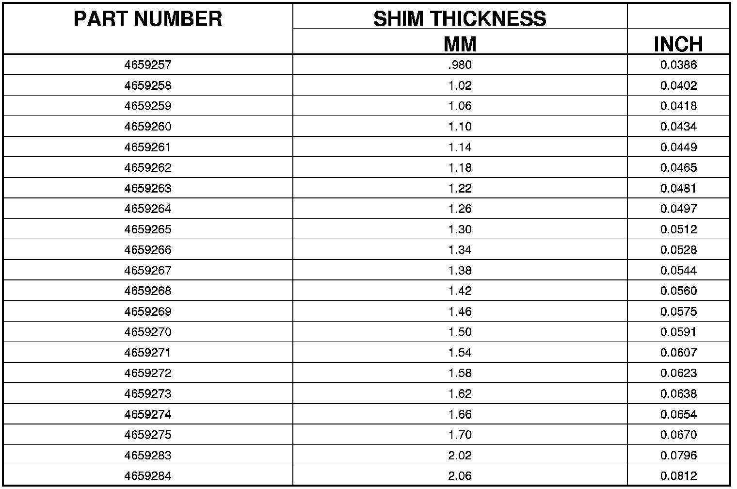 DIFFERENTIAL BEARING SHIM CHART