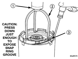 38. Tap reaction plate (3) down to allow installation of the reverse clutch snap ring (1) Install reverse clutch snap ring (1).