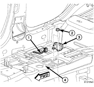 1. Install dynamics sensor (3) over studs mounted to floor pan tunnel (4).